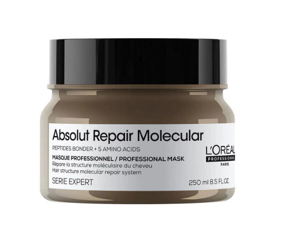 Cuando el cabello está dañado, su estructura molecular, compuestaporpéptidos, se ve comprometida. El cabello se quiebra, se vuelveelásticoy pierde movimiento. La mayoría de los péptidos son demasiadograndespara ser reinyectados en la fibra capilar, lo que hace que el dañoseacasi irreversible.Descubrimiento científico: Absolut Repair Molecular. Repara 2 añosdedaño en un solo uso*. Por primera vez, la Investigación AvanzadadeL’Oréal Investigación Avanzada ha logrado descomponer los péptidosparainyectar sus componentes por separado en la fibra capilar**. Unavezdentro, estos componentes se recomponen y reconstruyen laestructuramolecular del cabello***.Máscara professional concentrada, formulado con reparador deenlaces+5aminoácidos, repara el daño para un cabello 7 veces másrellenado****.El cabello está más fuerte (+94 % de fuerza*****) con mayorelasticidad,movimiento y un 85 % más suave*****, con un mayor desenredado yflexibilidad. *Prueba instrumental sobre la estructura macro-molecular de lafibradespués de la aplicación del shampoo Absolut Repair Molecular +sérumdeenjuague Absolut Repair Molecular + máscara sin enjuague AbsolutRepairMolecular.**Reparador de enlaces y aminoácidos***Prueba instrumental después de 7 aplicaciones del shampooAbsolutRepair Molecular + sérum de enjuague Absolut Repair Molecular +máscaraAbsolut Repair Molecular****con hidratación a nivel macro-molecular. Prueba instrumentalrealizada 72 horas después de la aplicación de la máscara deAbsolutRepair Molecular*****Test instrumental después de la aplicación de la MáscaraAbsolutRepair Molecular. Rellena las capas moleculares del cabello*.+94% cabello más fuerte**+85% de suavidad**, con un mayor desenredado y flexibilidad. * con hidratación a nivel macro-molecular. Prueba instrumentalrealizada72 horas después de la aplicación de la máscara de Absolut RepairMolecular.** Test instrumental después de la aplicación de la MáscaraAbsolutRepair Molecular.